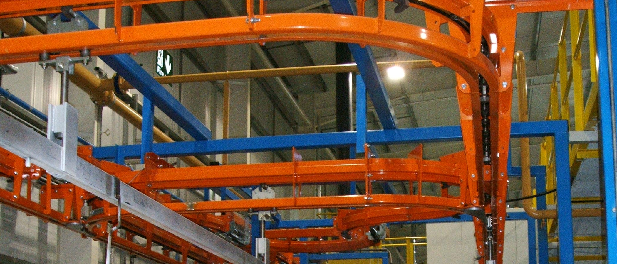 Das Prinzip von Hängekettenförderern besteht darin, dass sie eine durchgehende, angetriebene Kette in einer Schiene verwenden. An der Kette sind in regelmäßigen Abständen Anhänger angebracht, an denen die zu transportierenden Produkte entweder direkt oder mithilfe von Laststangen oder speziell angefertigten Trägern aufgehängt werden. Anstelle von Anhängern können auch Mitnehmer an der Kette angebracht werden, um Wagen entlang einer zweiten Schiene zu schieben, die normalerweise unterhalb der Kettenschiene angebracht ist. Die zu transportierenden Produkte hängen wiederum an den Wagen. Diese Art von Hängefördersystem wird als „Power & Free“ bezeichnet.