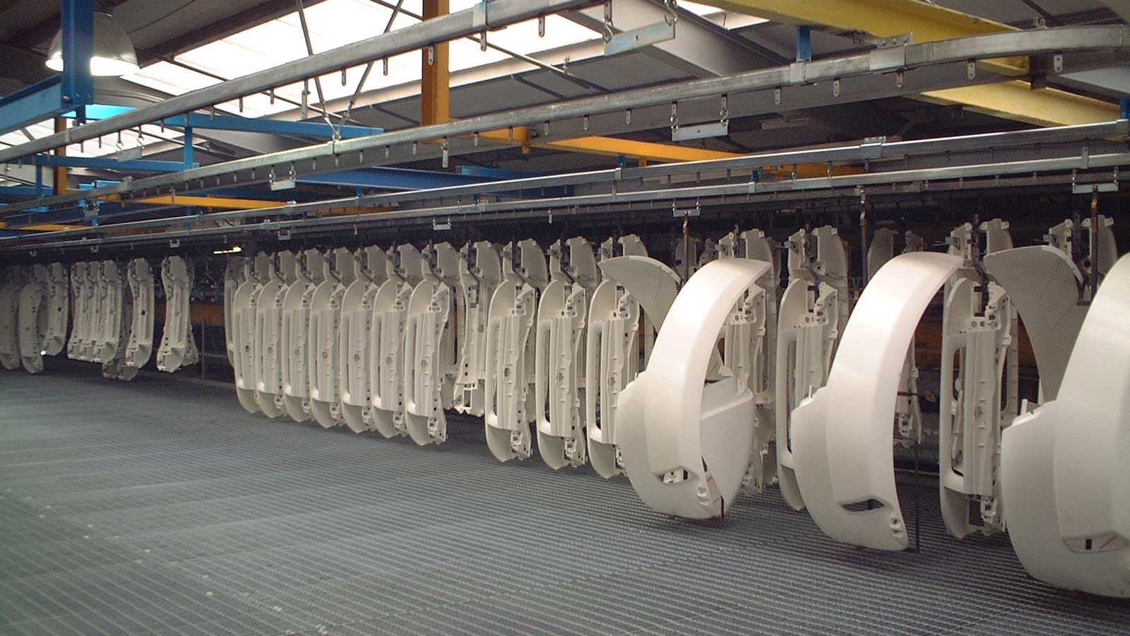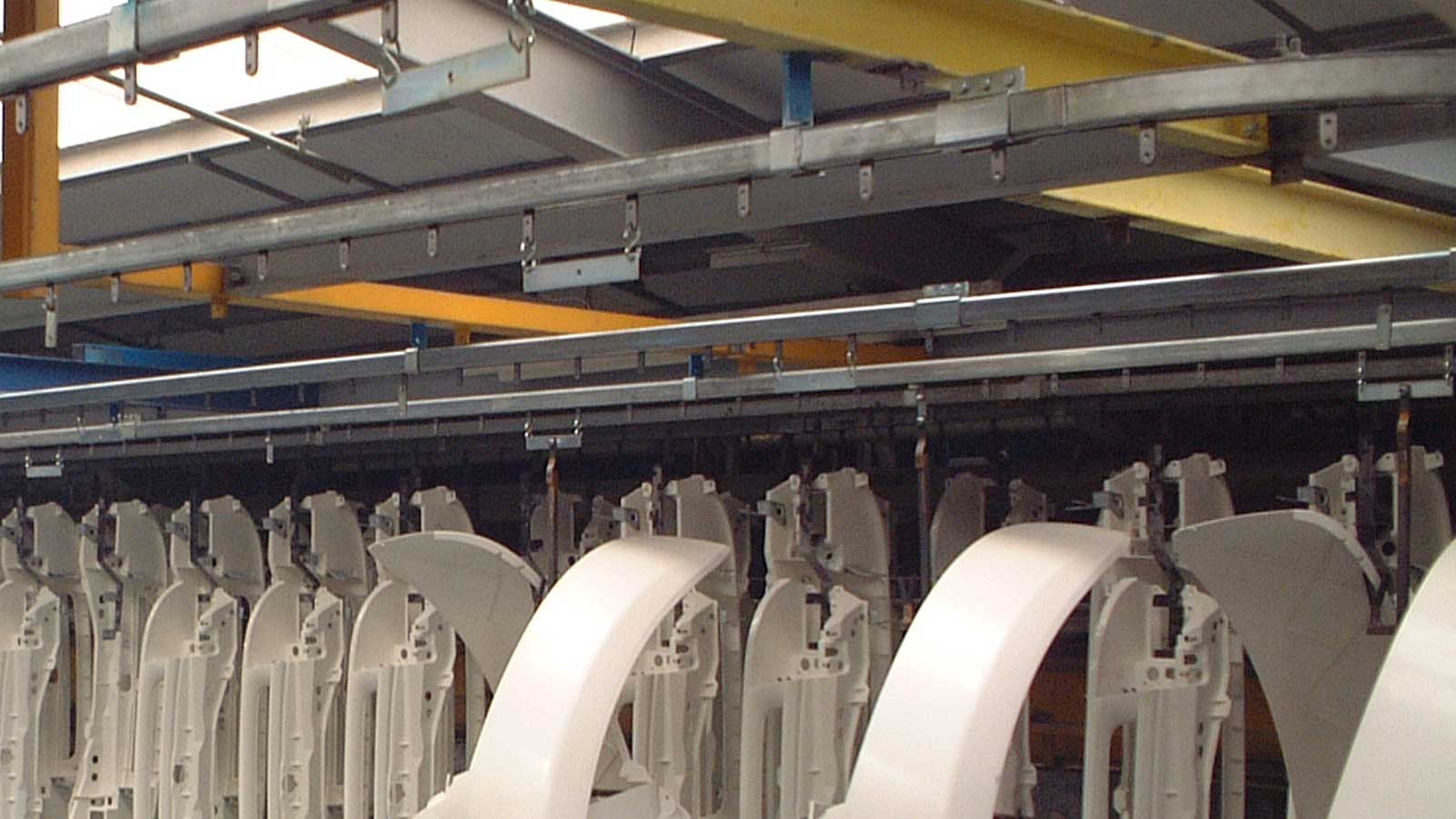 Diese Fördersystemreihe umfasst die Modelle PT30, PT60, PT100 und PT100S. Diese Systeme bestehen aus einer biplanaren Kette, die von einer Antriebseinheit angetrieben wird und in einer geschlossenen Stahlschiene läuft. Diese kann entweder einen rechteckigen Querschnitt oder, falls eine höhere Tragfähigkeit erforderlich ist, eine Kreuzform aufweisen. In regelmäßigen Abständen sind an der Kette Anhänger befestigt, die durch einen Schlitz an der Schienenunterseite ragen und an denen das Produkt aufgehängt werden kann.