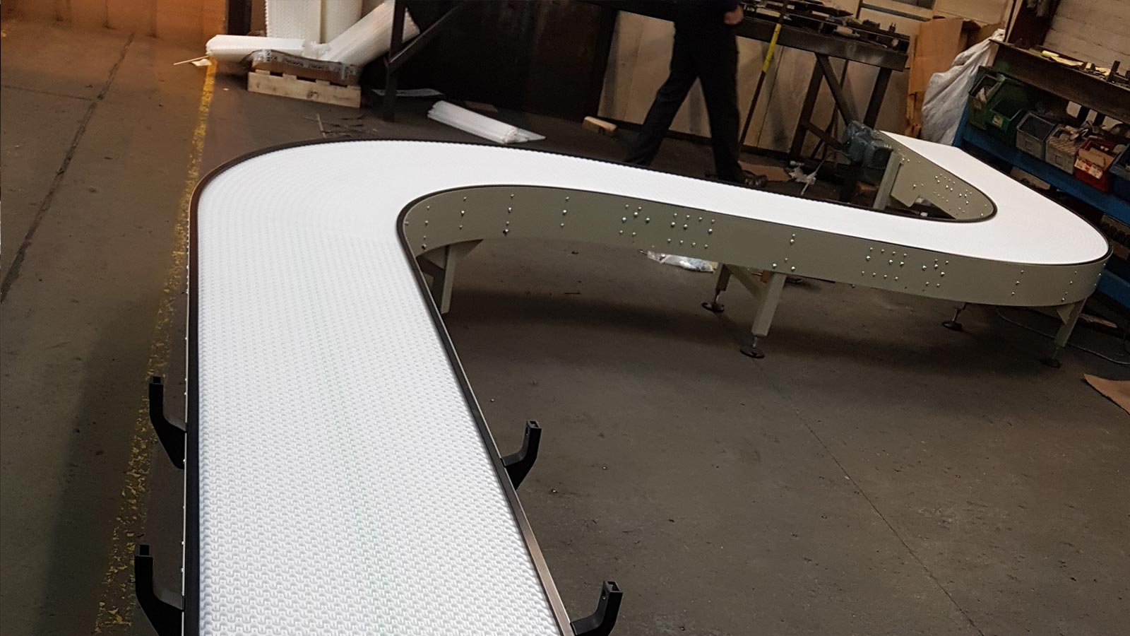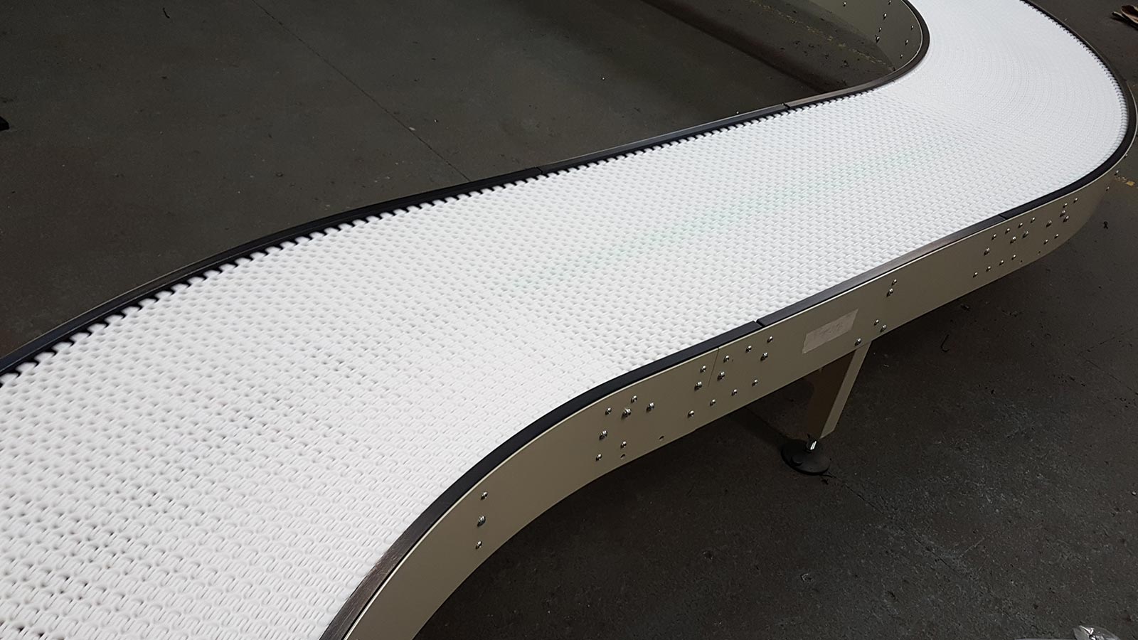 Die Konstruktion aus Lamellenketten und Plattengliederbändern ermöglicht dem Band Flexibilität, wenn die Platten in der Mitte ihrer Spannweite durch ein Scharnier verbunden sind. Dies bietet den Vorteil, dass diese Förderbänder Kurven problemlos bewältigen können.